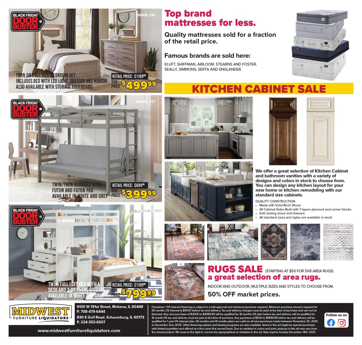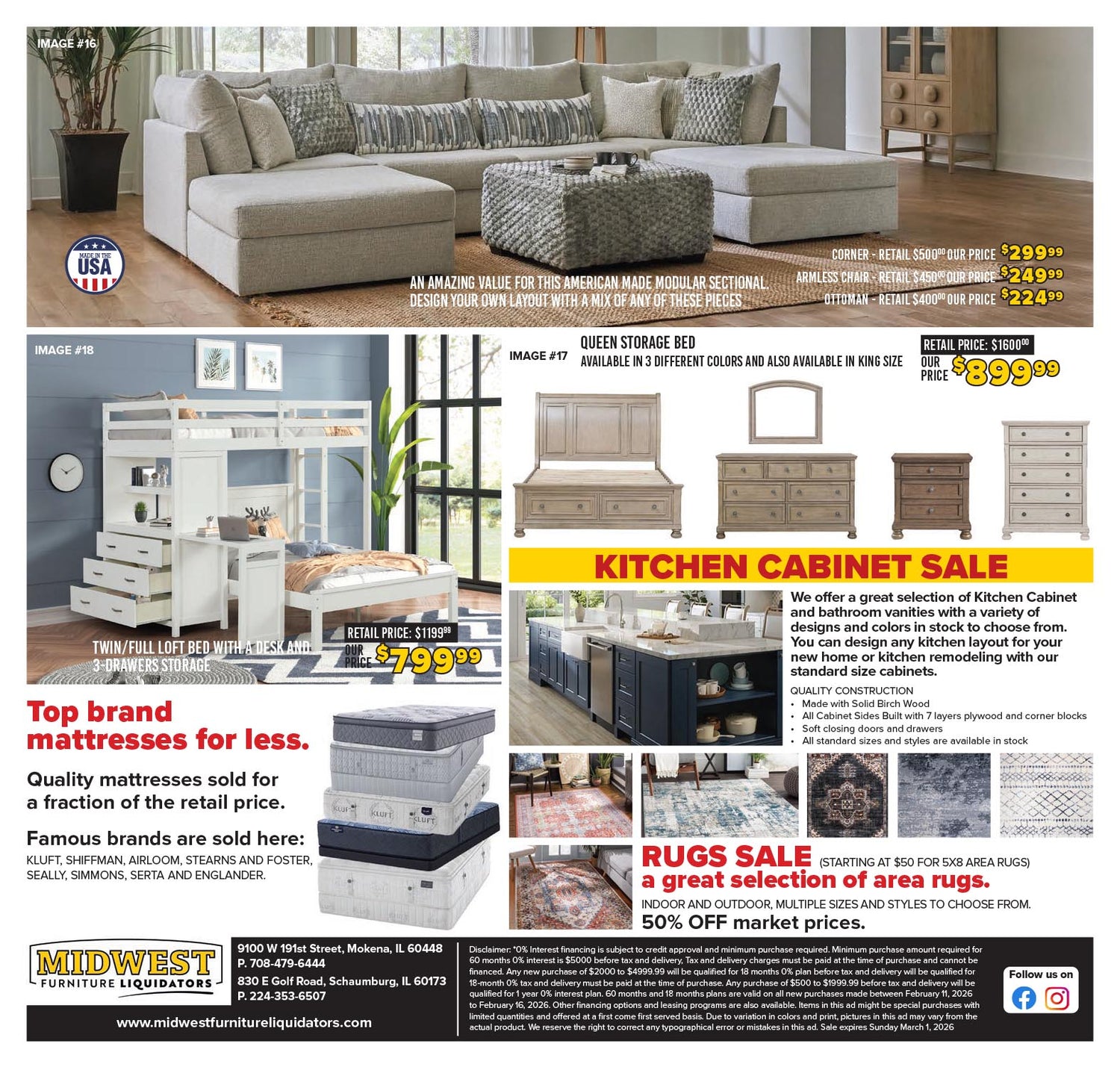 Midwest Furniture Liquidators' goal is to be the leading source of stylish, quality, and affordable home furnishings in the greater Chicago Metropolitan area. Our business model is focused on partnering with leading American factories and distributors to bring to you the best value of home furniture and mattresses. Not only do we buy and liquidate deep quantities of overstocked and discounted merchandise, but we also bring to you the latest styles and trends of modern and casual home furniture that fits everyone's needs. We only open for public 3 days a week Friday-Sunday to save on the operation overhead cost and pass it on to you through our discounted prices.