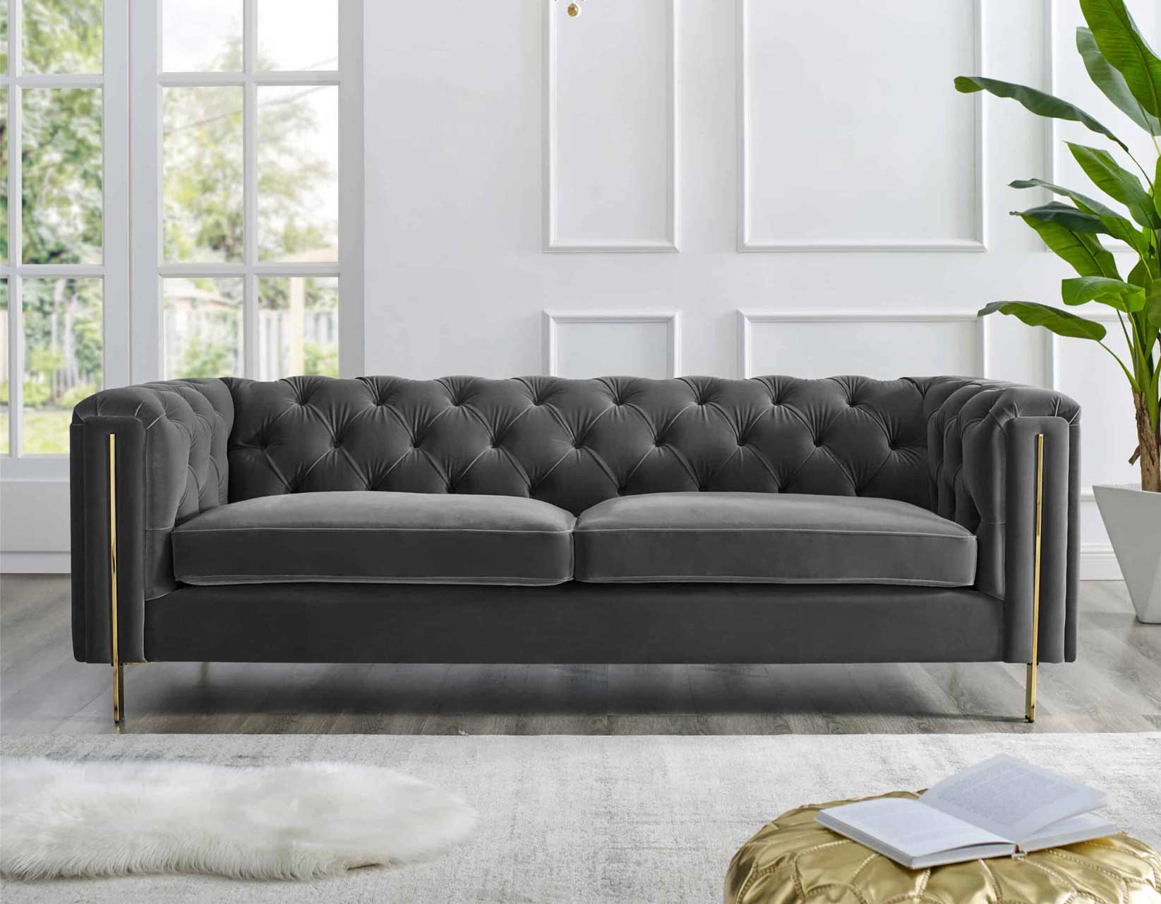 Charlene Gray Velvet Button Tufted Rolled Arm Chesterfield Sofa